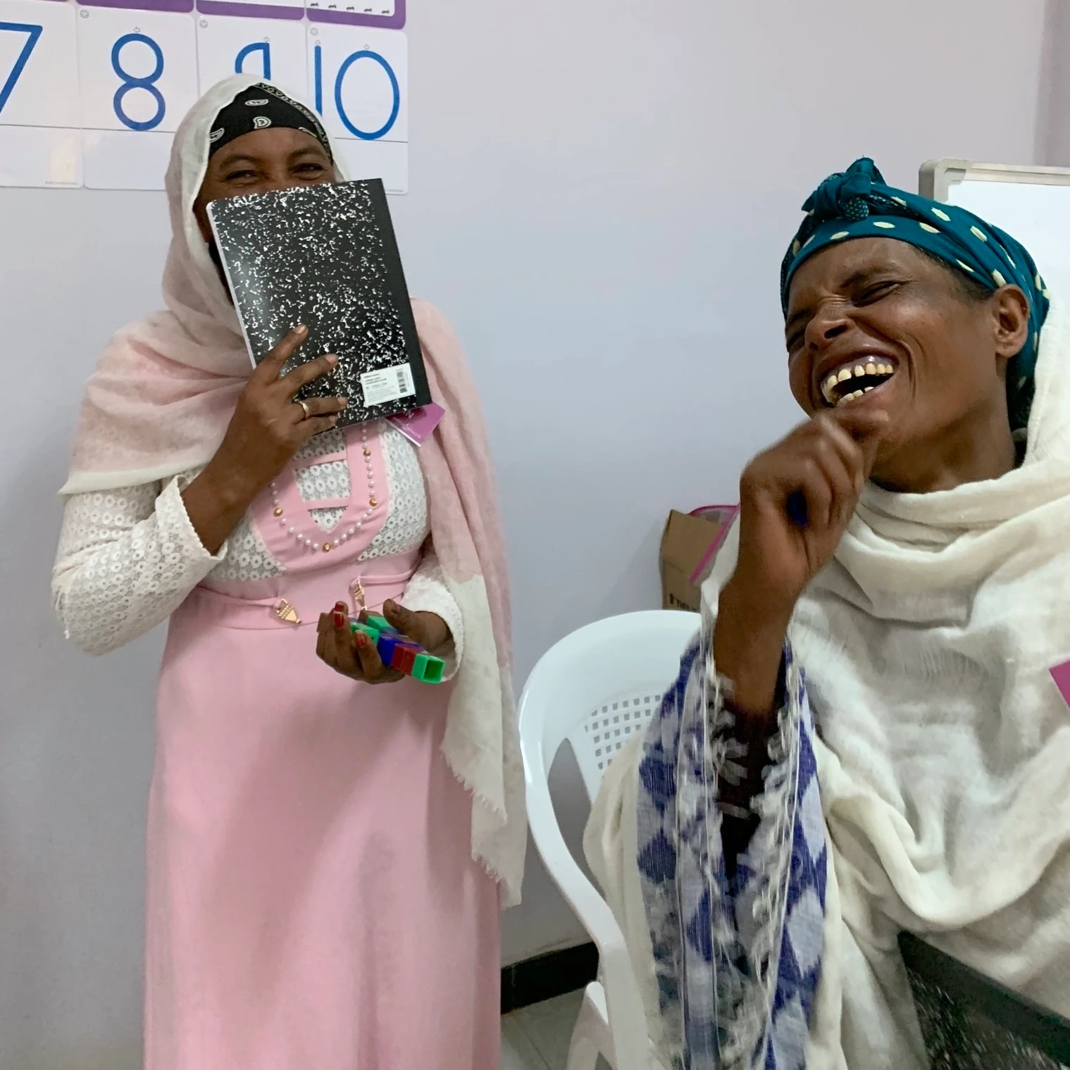 As we handed out the sketch boards and other math manipulatives, you could see some of them exchange nervous looks and those looks became nervous giggles as we instructed them in writing their numbers. Despite the difficulty that many of them had, none of them gave up and by the end of our time together, they were smiling and showing off their work to each other.